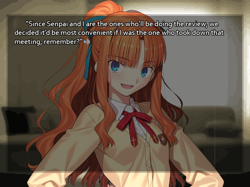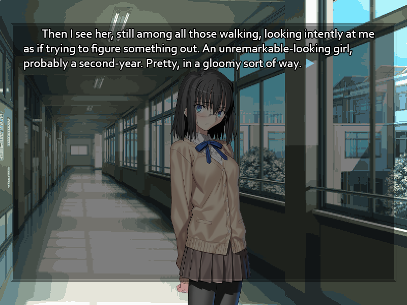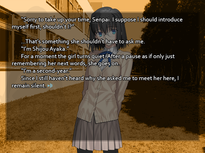 Perhaps the best way to brush this off is to turn it into a joke. With a grin, you reply, "Lately, I've decided that in order to properly evaluate the performance of the athletic clubs I should be able to perform to the standards of any of their members." Making a show of it, you roll your neck, prompting a pop from stiff vertebrae. "I ended up taking my personal training a bit too far yesterday, and it left me pretty worn out." "Wo~w." The girl's eyes widen as she holds a hand before her mouth in a gesture of surprise. "As expected of Senpai! Nobody's ever taken being a student council president as seriously as you, huh? Wanting to do all the club activities as well as the members just so you can judge them, that's <span class="mu-i">some</span> rigor! But are you going to do the same thing with the cultural clubs? I can't see how you'd fit enough hours into a day!" For all her words of praise, the girl's eyes are still merry, and her tone is half-joking. It's apparent she finds the energy your put into your student council work at least a little absurd. Probably this is the type who prefers to spend her after-school hours in a game center or going to karaoke with a gaggle of friends. Why she's interested in your routine, then, is more of a puzzle, but perhaps there's nothing to it. As a result of your persistent campaigning year after year, your name is better-known at school than that of any other student; there are bound to be some with an immoderate degree of curiosity about you, especially among people who don't think the student council is worth putting time into. "There are practical benefits," you answer with a nod. "Based on my own progress in training without equipment, I've already identified a few places we can slash budgets and save the school some money. If I didn't put my own time into researching the matter, I might never have realized how much unnecessary expenditure we've put into supplying the clubs with machinery they don't really need. And speaking of time," you glance meaningfully at your watch, "I should be getting to class. I'm sure you don't want to be late either, no?" "Oh!" The girl looks startled at how late it's gotten already. "You're right, Senpai! If I don't run for it, I'll be late! Have a good one!" With a last energetic wave, the mystery girl turns and runs back to the stairwell, making her way down to her own year's floor. You never did get her name, or even what year of student she is. Maybe you should ask around... but then again, if you really do know her and have somehow forgotten, asking questions will only make you appear a fool. Something to think about later, perhaps.