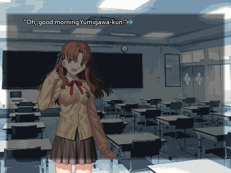 No, on reflection you really don't have the time to make any detours. You'll just have to hope this headache fades as the day goes on or soldier through it. Picking up your school bag, you make for the door and step out into the brisk winter morning. A few drifting clouds cast patches of shade on the bright day, but for the most part the sunlight is clear and pale, as perfect a morning as one can hope for this time of year. Instinctively you pull your uniform jacket closer about yourself, startled to see your breath forming white clouds in the air. Though it's no colder or warmer than yesterday, somehow the climate feels incongruous; looking out your window, you had somehow come to expect the stultifying heat of midsummer. Perhaps you're still half-asleep, thinking such foolishness. At least the cold should clear the drowsiness from your mind. It's a quiet neighborhood, your home, peaceful enough to give the lie to the morning's report on crime and underpin your mother's expectations of ever-reliable comfort. Well-kept houses and apartment blocks with no more than two floors line the streets, the trees that grow in their yards providing a touch of life even when winter's robbed them of greenery. Pedestrians are few. Your fellow students can be seen here and there, making their own ways to school in their own little cliques, but no others. One can easily forget, in the suburban calm, that the bustling heart of Shinjuku is only a short walk away. It isn't toward the commercial districts you're heading, though. Kyoutenkan lies to the west, deeper still into the suburbs. A prestigious school well-known for supplying students to Tokyo University, its location was chosen to prioritize quiet and calm study without recourse to real seclusion. As it's something of an academic target school, most of the students have to commute by train from more distant districts of the Tokyo metropolis. You can count yourself lucky to be able to get there on foot, a fact your father was keen to drive home when you were discussing what high school you'd be applying to. All part of the road to success the Yumigawa family has carefully laid out before you. After a half hour's walk, you find yourself at the gates of your school, your head feeling much recovered. Sure enough, some fresh air and exercise really was all you needed to shake off the strange malaise that's been hanging over you all morning. Smiling and nodding, but never coming close enough to actually speak, to the students you recognize and those who recognize you, your constituency, you pass through the gate and make your way toward the school building.