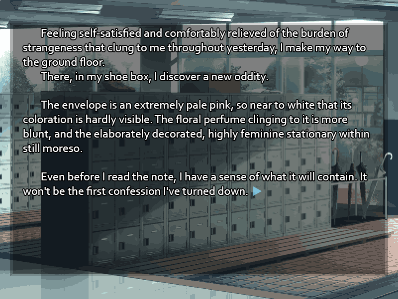 Sweets-Loving QM !!m9IjZ66S7uQ ID:ZHb4YujP Sun 15 Jun 2025 03:36:37 No. 6258508 Report "Nothing in particular," you answer, giving the girl a warm smile to ward off the apprehensive chill at the back of your mind. Surely there's some normal explanation for all this. "I had a bit of a delay in getting out of the house this morning, that's all. Not even I can be perfect every day." "Kyahaha!" The girl lets out a peal of laughter at your mild joke, apparently finding it quite a bit funnier than you meant it. "So you can tell jokes too, huh, Senpai? I thought you'd be just as stern as you are at meetings all the time, but I guess not! Good for you, it's no good to be all business <span class="mu-i">all</span> the time." The smile she's giving you is at least half as bright as the morning sun. All the more strange, you think, that you shouldn't know her. Between eye-catching beauty and a personality this friendly, the girl must be the center of attention wherever she goes. No matter. With the exchange of pleasantries finished, you can move on to your class. "No, maybe not," you say. "Now, if you'll excuse me..." No luck. As you go to pass by her, the mystery girl falls in by your side in a perfectly natural motion. Looking up into your face as she walks beside you, hands folded behind her back and her head tilted at an angle that maximizes the charm of her sparkling eyes, the girl fires off a battery of questions. Teasing ones, at that, as her playful tone makes it perfectly obvious she knows you wouldn't have wasted an evening on frivolous entertainment. "So what <span class="mu-i">did</span> keep you, anyway? Up late watching a drama? Maybe you lost track of time playing computer games? If it made <span class="mu-i">the</span> Yumigawa-senpai sleep late, something pretty interesting must've been taking up your time last night, right?" The mystery girl's infectiously cheerful voice fills your ear as you pass by the shoe racks and climb the stairs up to the third floor. Looking around to see if the way this unknown girl is sticking to you seems as unusual to anyone else as it does to you, you finally spot Ikeda Seito, Treasurer for the Student Council, passing in the other direction as you make your way down the hall toward your class. You meet his eyes, but he just gives the two of you a lukewarm smile, as if to say 'Again? You two really are inseparable.'