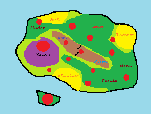 In the center of the island live two quarreling groups of dwarves underground, locked in an unwinnable war in the tunnels, the Korn and the Zorak. They have in excess of a 100,000 dwarves each, their army about 2,000 dwarves. They are always training more soldiers and often lose men in skirmishes. There is no way they can ever route out their enemies. If they ever stop quarreling and join together, they would be the dominant force in the island.