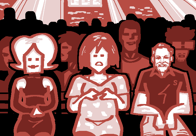 "Just saying. You'd think that at a big event like this, people would be a bit more dignified." She turns to look at the big black block letters that burned boldly on the arena sign.