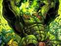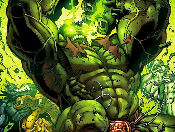 “Hulk beat puny gods! Hulk breaks worlds!” the bigger green bellows, swinging a double hammer fist down at Karn, who dodges easily, sliding as he hits the ground into his fighting stance.