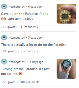 >>11572172>I really wish the paradise was a lot smaller. The Uni was the perfect form factor imoYou can blame the Tamagotchi community collectively hating rechargeables for this.