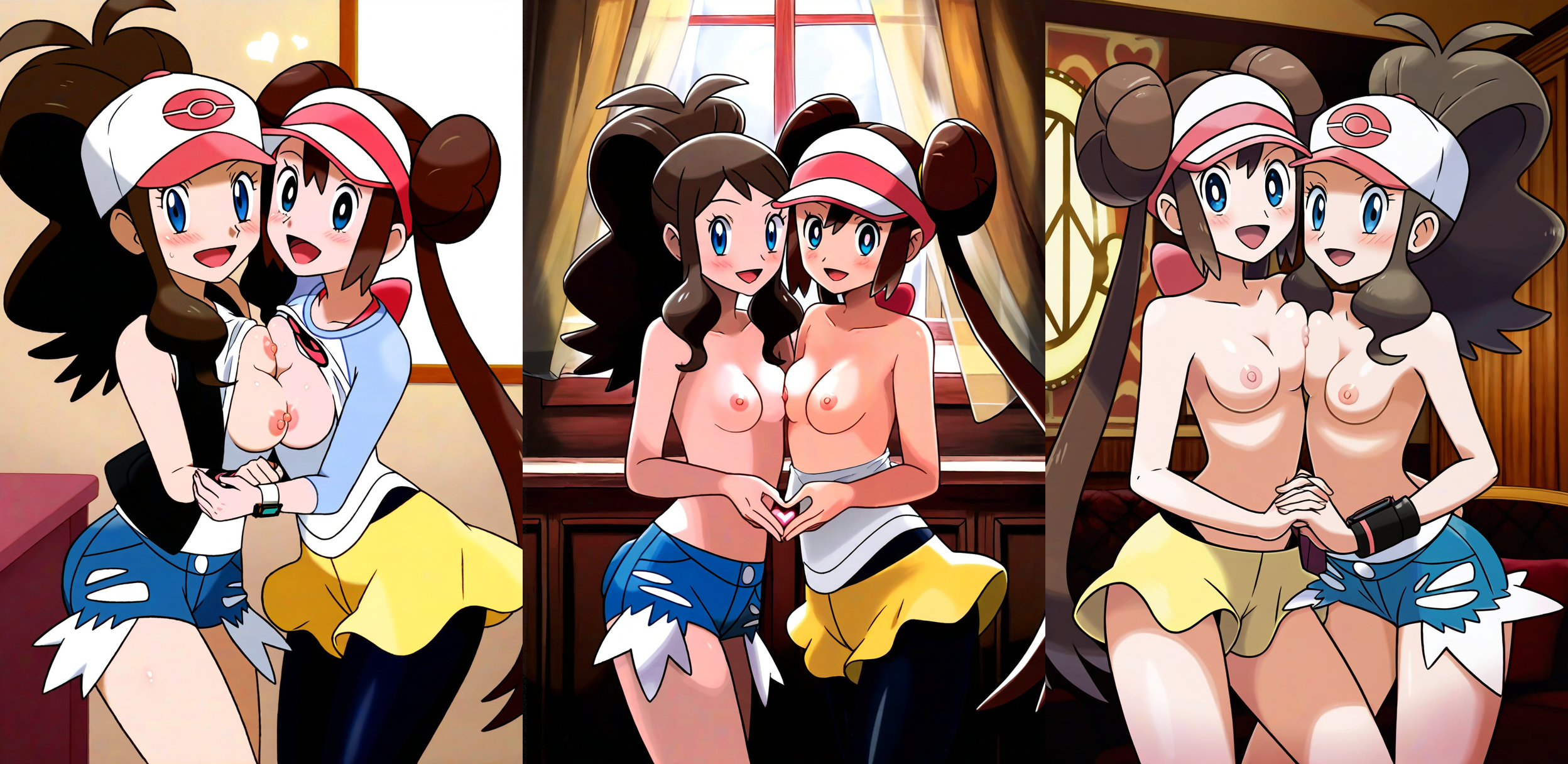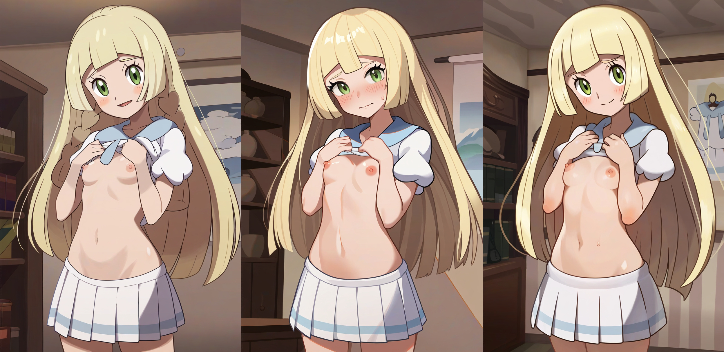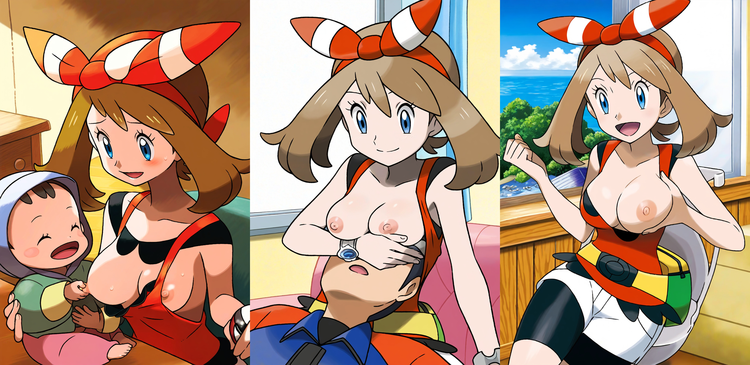 Requesting either Dawn blushing wearing only high leg panties with medium sized breasts or May blushing with only low leg panties with large breasts.