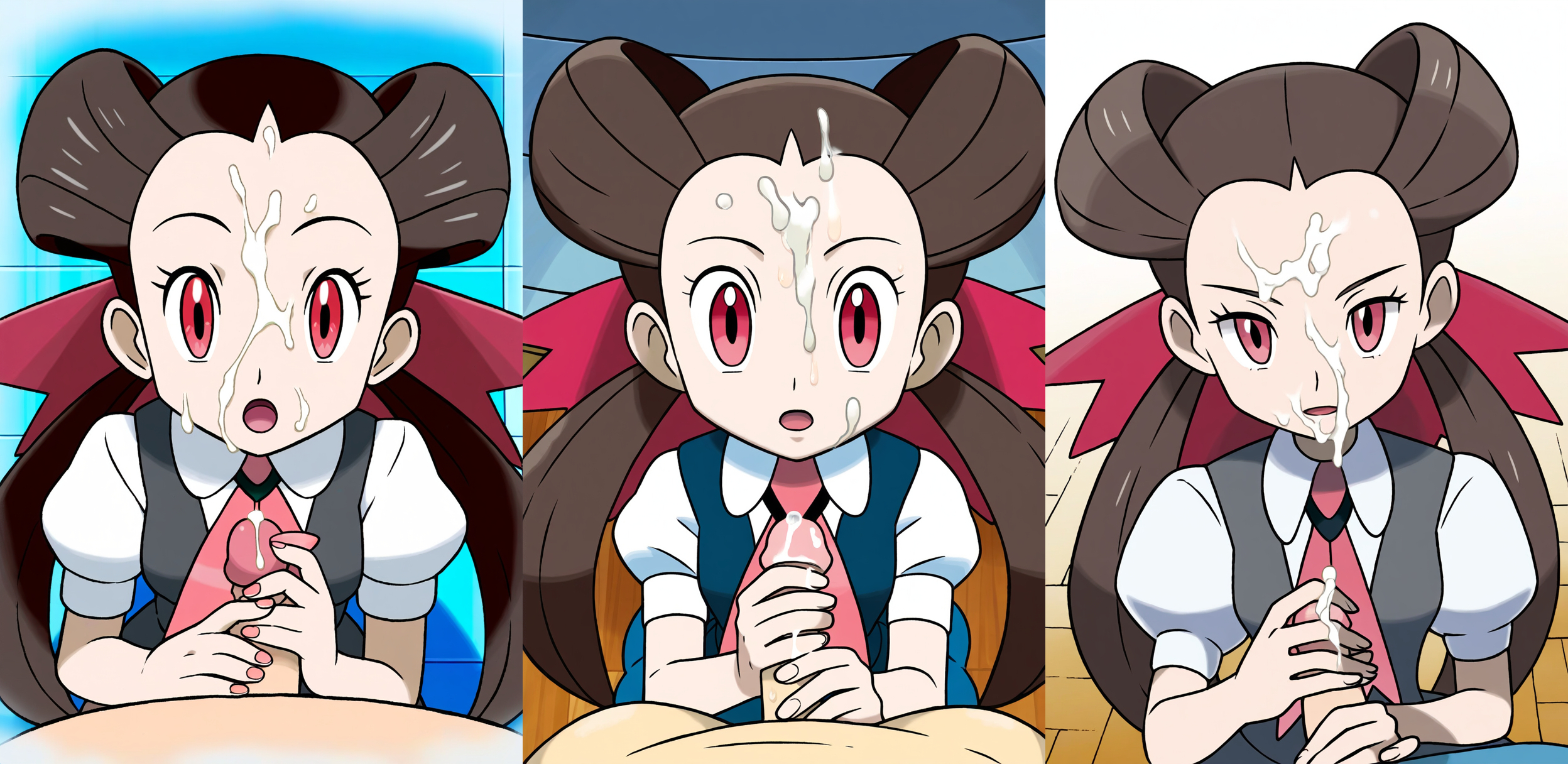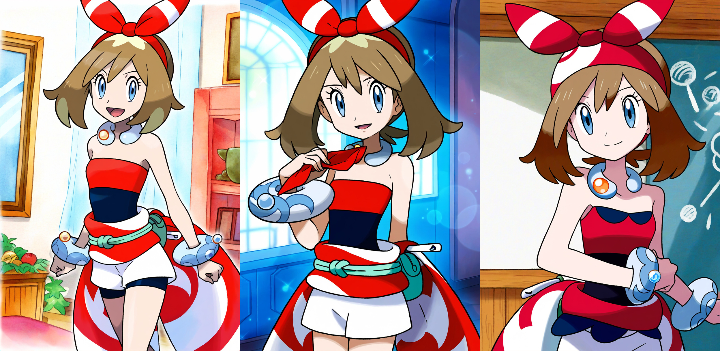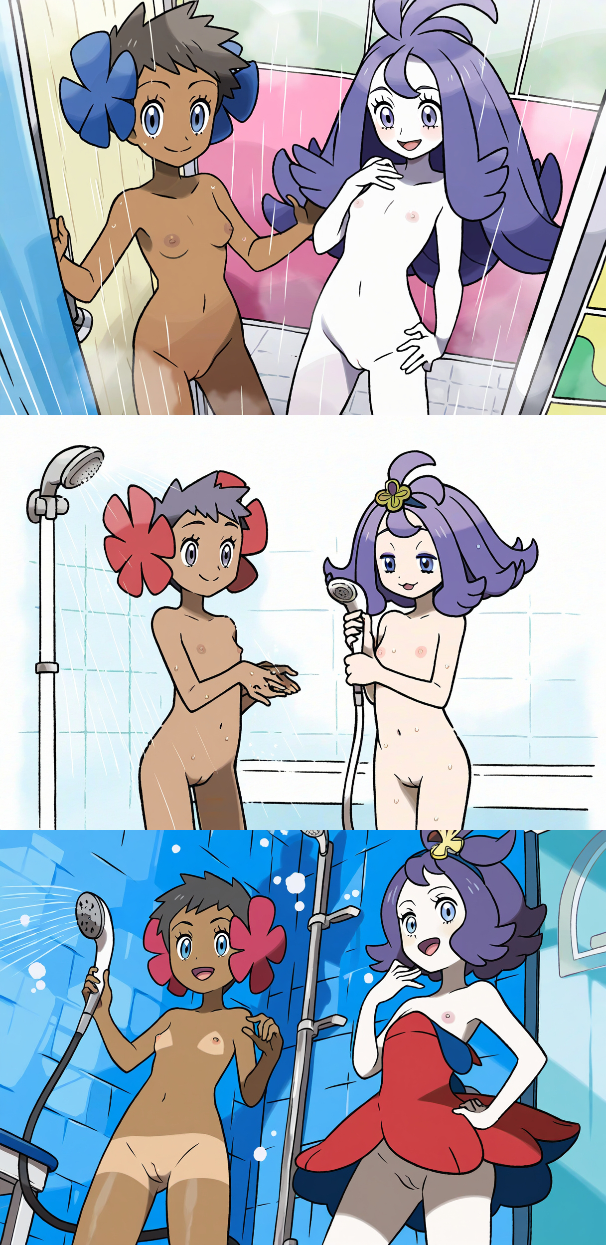 Requesting either Dawn blushing wearing only high leg panties with medium sized breasts or May blushing with only low leg panties with large breasts.