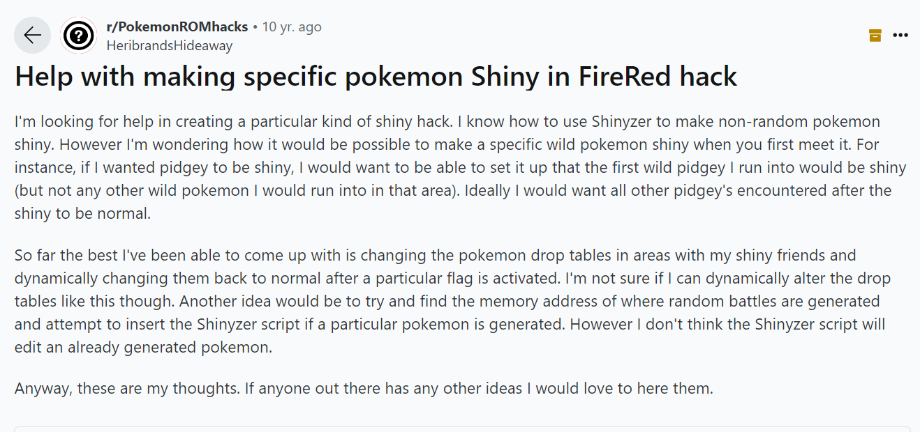 Does anyone else remember downloading a ROM of FireRed or LeafGreen(I dont remember if it was one of them specifically or both) and whoever had uploaded it made it so a shiny Pidgey alway appeared on your way to get Oaks Parcel before you had any Pokeballs? I swear I encountered this ROM quite a few times back in the days when ROM downloads were way less centralized and it always infuriated me. Looking back on it now it was pretty funny. The game was completely normal otherwise as far as I remember.