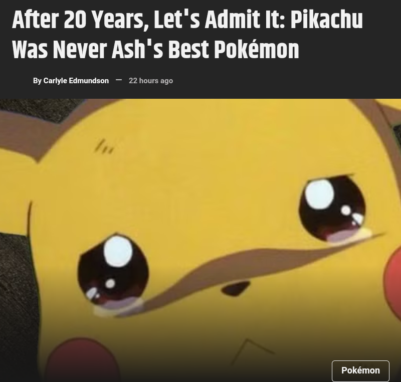 >>57413277"Journalism" is incredibly lazy blogging now. This is junk information to hit a quota, a bullshit article with a false premise about nothing anyone has ever said. It's been Snorlax, Charizard, and Kingler since the 90s, anyone who watched the show knew Pikachu lost to dumb bullshit as much as he won with dumb bullshit. He was exactly as strong as the plot required at that moment in time.