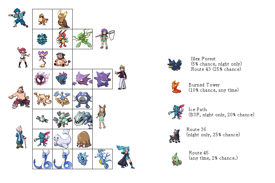 >I’d move Murkow, Houndour and Misdreavus to the routes surrounding Ecruteak>Larvitar should be in the deepest parts of Mt. Mortar.