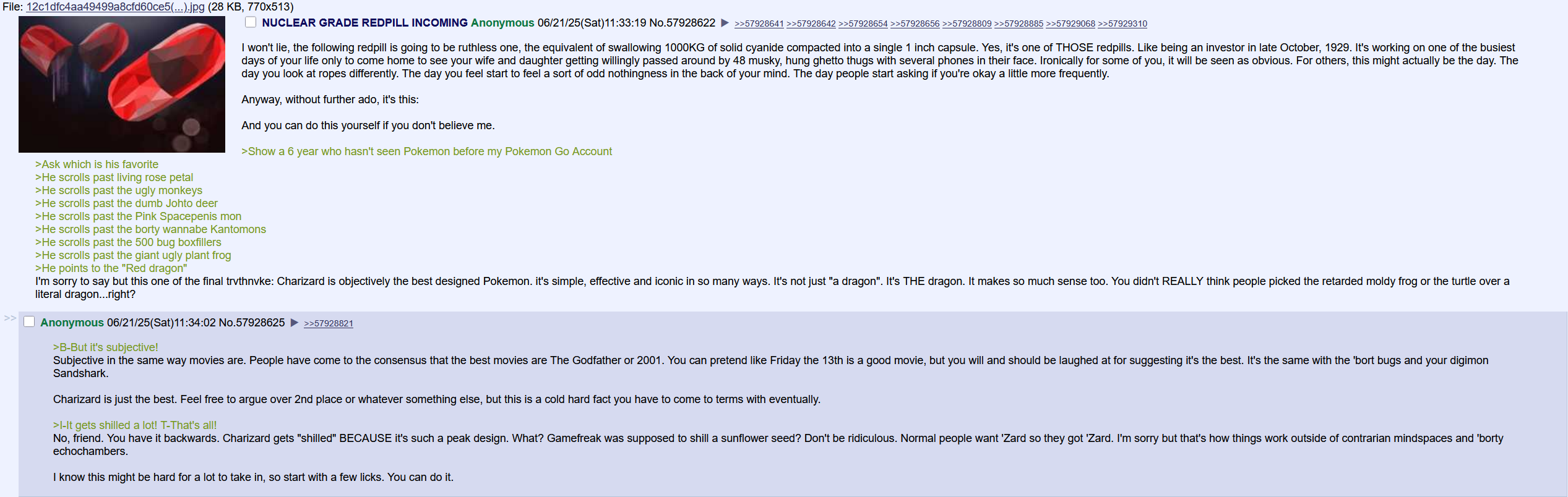 I'm sorry to say but this one of the final trvthnvke: Charizard is objectively the best designed Pokemon. it's simple, effective and iconic in so many ways. It's not just "a dragon". It's THE dragon. It makes so much sense too. You didn't REALLY think people picked the retarded moldy frog or the turtle over a literal dragon...right?