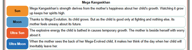 >Should you feel yourself attacked by a sudden chill, it is evidence of an approaching Gengar. There is no escaping it. Give up.>Stories go that it grabs the hands of small children and drags them away to the afterlife. It dislikes heavy children.>If a child it has made friends with is bullied, Drampa will find the bully’s house and burn it to the ground.>Fourty million dex entries describing what pokemon they eatLike, drifloon always had a thing taking children, but what's with the joke about fatties? The predation dex entries tend to feel forced as well.