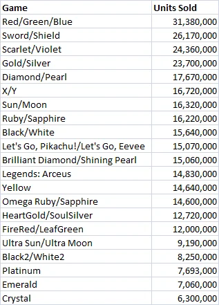Gen 2 had 3 titles, Gold, Silver and Crystal, total sales are 30. That's 10m per title.