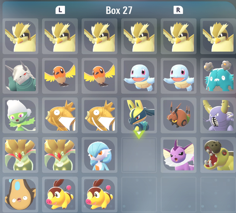Normal shinies: Malamar, Pyroar, Litleo, Roserade, Dragalge, Heracross, Fletchling, Altaria, Swablu, Weedle, Noivern, Noibat, Bagon, Gardevoir, Garbador, Trubbish, Drilbur, Doublade, Chikorita, Totodile, Weepinbell, Pidgey, Gastly, Buneary, Krokorok, Sandile, Numel, Esper, Machop, Aggron, Pinsir, Skiddo, Bulbasaur, Squirtle, Scraggy, Spinirak, Fennekin, Whirlipede, Carvanha, Pansage, Pansear