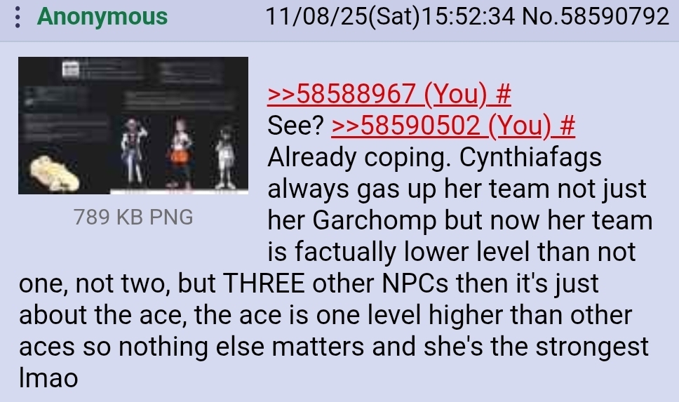 But now they are malding because by that same rule, Cyrano, Nemona and Kieran do have stronger teams than Cynthia despite their aces being one single level behind so by their own rules not only Cynthia is weaker, she's also a trainer with a more disbalanced team where her ace does most of the heavy lifting compared to her other mons.