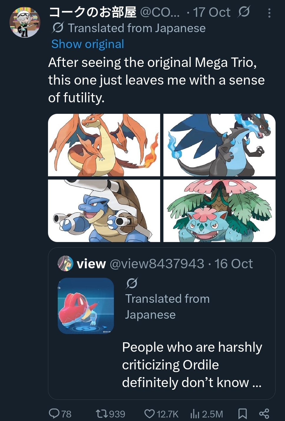 >>58593464Not the anon above but a close friend of mine whom I’m planning to visit this winter, picked Tepig as a starter, told me that Mega Ordile (Feraligatr) was actually appreciated there. In her own experience, she worked as a teacher, most of her students in the classroom she’s teaching overheard them cant stop talking about Waninoko (Totodile) the whole day. Saying Mega Ordile reminded them so much about their childhood of watching kamen rider zero one few years ago. Few others in her classroom talks about Meganium and Chikorita too along with Pokabu (Tepig) and Enbuo (Emboar) and it was days after the release of ZA.