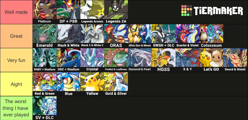 I also like Gen I because it's nice to play a Pokémon game with the fewest amount of things to worry about. No shinies, no genders or gender differences, no breeding, no natures, no friendship, no ball on the title screen, no "proud of its power", no fancy icons, no Pokérus, etc. I just wish DVs weren't present and stat experience could be gained in a less tedious way.