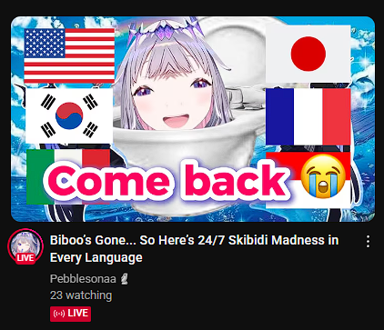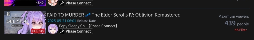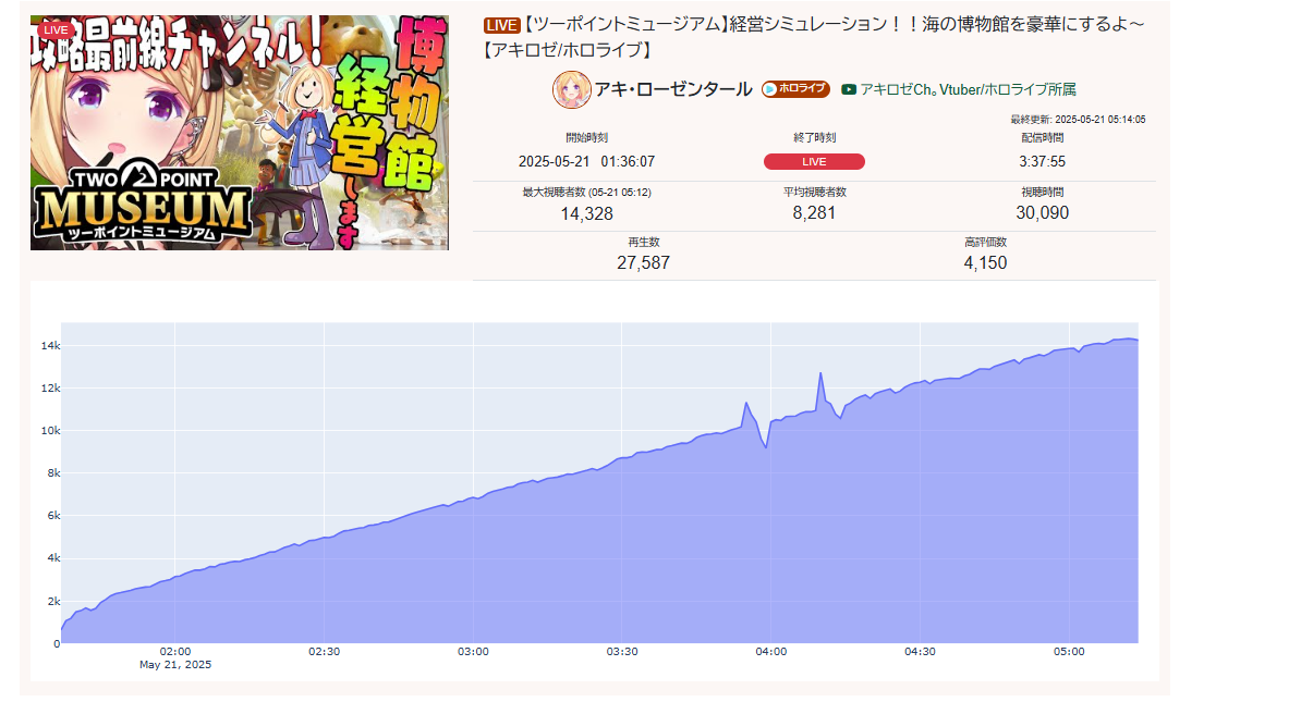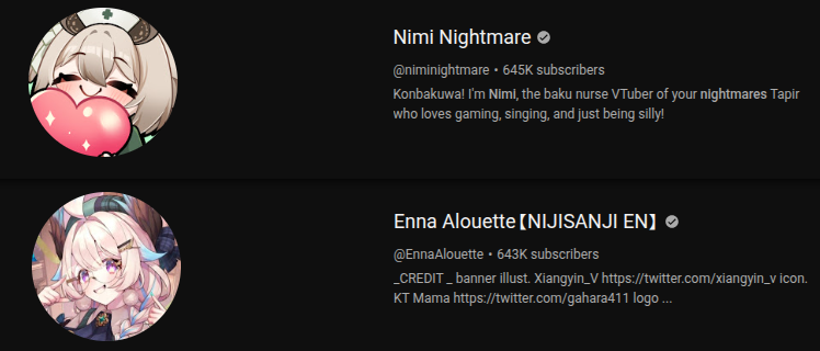 >1) 10,717: Ibrahim (nijisanji) Mario Kart 8 [33]>2) 10,004: Lisa (VSPO) radio collab [26]>3) 11,617: Toya (nijisanji) R.E.P.O. [40]>4) 10,040: Cecilia (hololive) Oblivion Remastered [41]>5) 10,162: Wen (nijisanji) Niji mario kart tournament A league [68]>6) 10,036: Shiori (hololive) ENigmatic REcollection Day3 [35]>7) 10,001: Elizabeth (hololive) ENigmatic REcollection Episode 04 [27]>8) 10,589: Calliope (hololive) ENigmatic REcollection Episode 5 [23]>9) 10,187: Elizabeth (hololive) ENigmatic REcollection Episode 05 [23]>10) 10,203: Korone (hololive) Chulip #01 [38]>11) 10,022: Kagami (nijisanji) furikaeri zatsudan [46]>12) 10,324: Luca (nijisanji) STARDEW VALLEY [28]>13) 10,306: Chigusa (nijisanji) DRAGON BALLZ: KAKAROT [26]>14) 10,054: Jurard (holostars) 3D DEVIL MAY CRY 5 [22]>15) 10,588: Mio (Hololive) >16) 10,066: Sho (Nijisanji)>17) 10,032: Kanae (Nijisanji) >18) 10,075: Ars (Nijisanji)>19) 10,822: Cecilia (Hololive) >20) 10,171: Nose (VSPO) > PER COMPANY9x: nijisanji