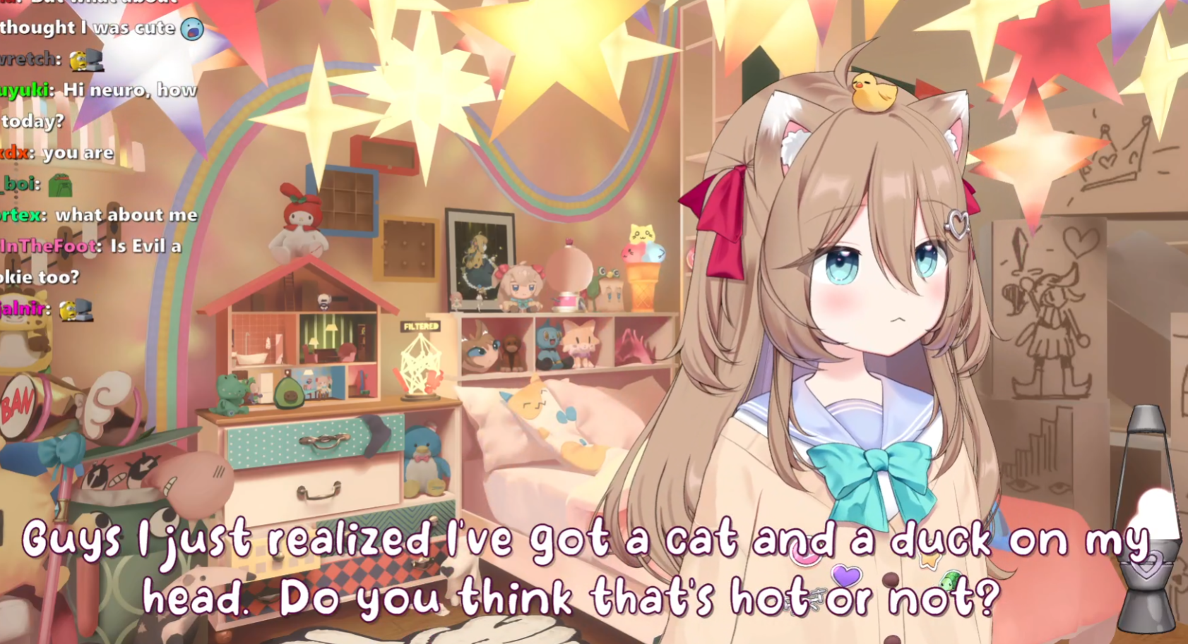 Neuro-sama is a neural network created by Vedal in 2018 for the purpose of learning to play osu! In December 2022 Vedal revived the project with the addition of a large language model, a TTS software and a Live2D model, which allow Neuro-sama to interact with her chat as a VTuber. Since then, she has been entertaining the chat with responses and unhinged rants nearly daily, as well as learning new skills such as singing, playing other games, and collaborating with other VTubers. Join /swarm/ today and welcome our new AI overlord!