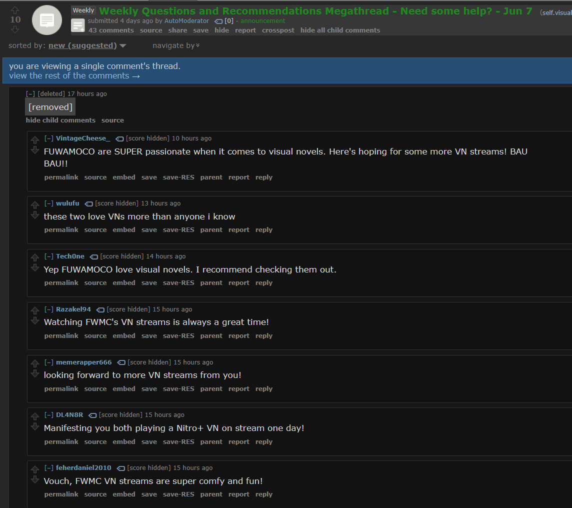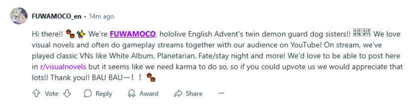 Thankfully fuwamoco would never do that and they wanted karma on r/visualnovels to do totally innocent things like make a post saying "hey r/visualnovels we also like visualnovel please subscribe to our youtube". This is different because fuwamoco are not lowly scum redditors and would never post on reddit begging for upvotes and youtube views and subscriptions.