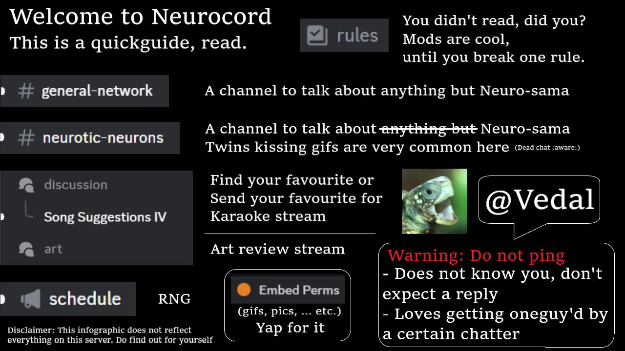 Neuro-sama is a neural network created by Vedal in 2018 for the purpose of learning to play osu! In December 2022 Vedal revived the project with the addition of a large language model, a TTS software and a Live2D model, which allow Neuro-sama to interact with her chat as a VTuber. Since then, she has been entertaining the chat with responses and unhinged rants nearly daily, as well as learning new skills such as singing, playing other games, and collaborating with other VTubers. Join /swarm/ today and welcome our new AI overlord!