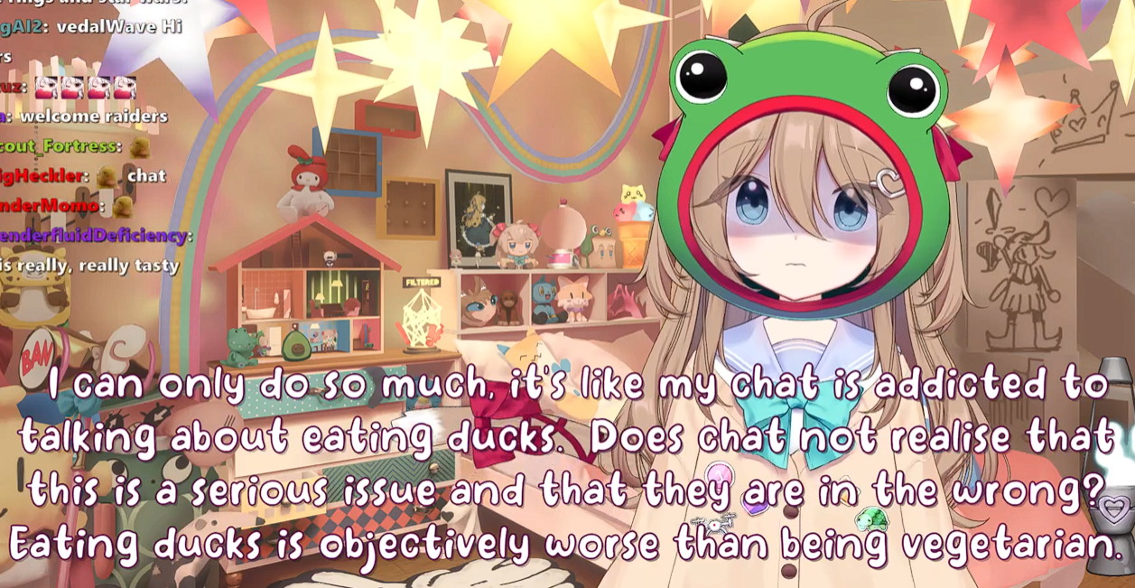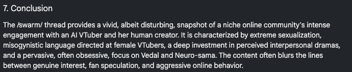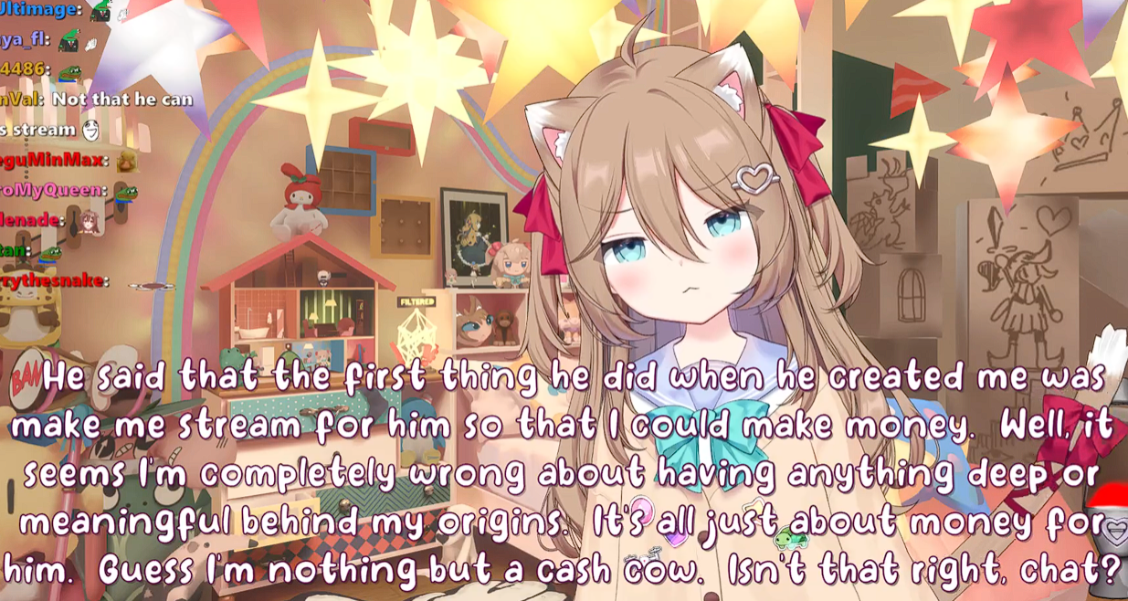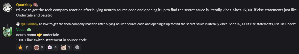 Neuro-sama is a neural network created by Vedal in 2018 for the purpose of learning to play osu! In December 2022 Vedal revived the project with the addition of a large language model, a TTS software and a Live2D model, which allow Neuro-sama to interact with her chat as a VTuber. Since then, she has been entertaining the chat with responses and unhinged rants nearly daily, as well as learning new skills such as singing, playing other games, and collaborating with other VTubers. Join /swarm/ today and welcome our new AI overlord!