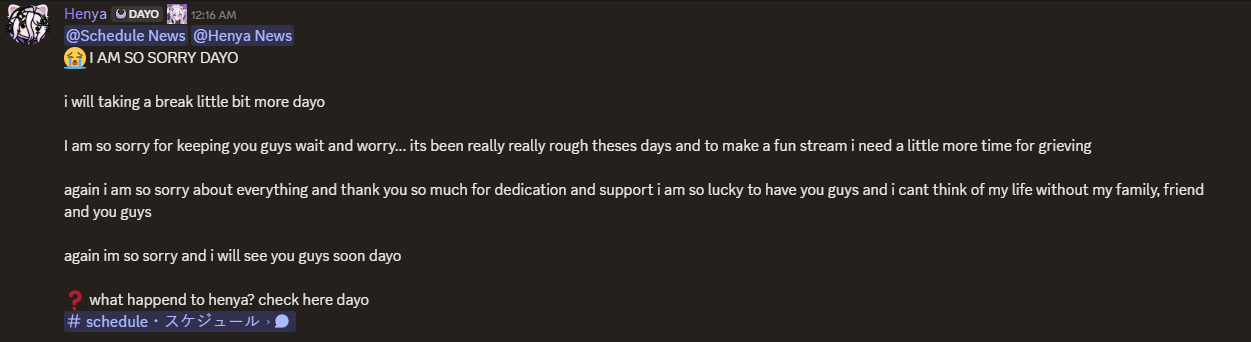 Zen and Ama are LIVE! And are about to go on a ghost hunt! Ama probably won't stick around the entire time but Zen is contractually obligated to do so. other than that Geega is LIVE! And is playing Persona 5. Like the mobile one, not the big one. And finally Henya is LIVE! And is playing ZZZ. Got that Ju Fufu sponsorship money. Other than that there's supposed to be some DND later, but until then make sure to keep things comfy and civil by ignoring and especially reporting bait, and being excellent to each other.