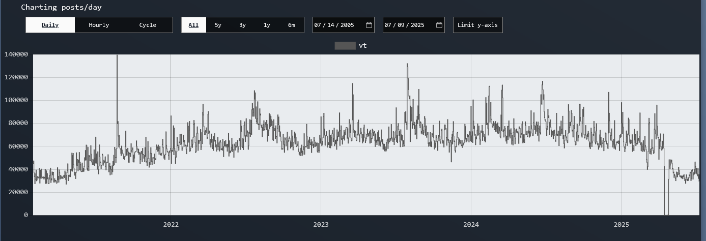 >>102103420it hovers around 15k-20k ppd, and that's for a place with basically only generals, no rampant automated spambots and no catalog bait threads padding the stats