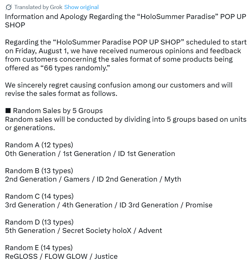 >Popular TalentsAlmost all cons, pros negligible. There is a slight chance that if the entire pie gets big enough as a result of this strategy that it will result in them getting a bigger piece, but they are the party with the most at risk if the fans balk and the least to gain if the strategy works. They are also the salespeople in the company that are actually effective so making the pitch more difficult harms them disproportionately. They're the ones who have to figure out how to spin dogshit into gold. The pitch that has always worked with merch is that you're supporting your oshi and getting a token of their appreciation for that. What is the pitch now? "Roll the gacha to find out if you supported your oshi or wasted your money"? Not compelling.