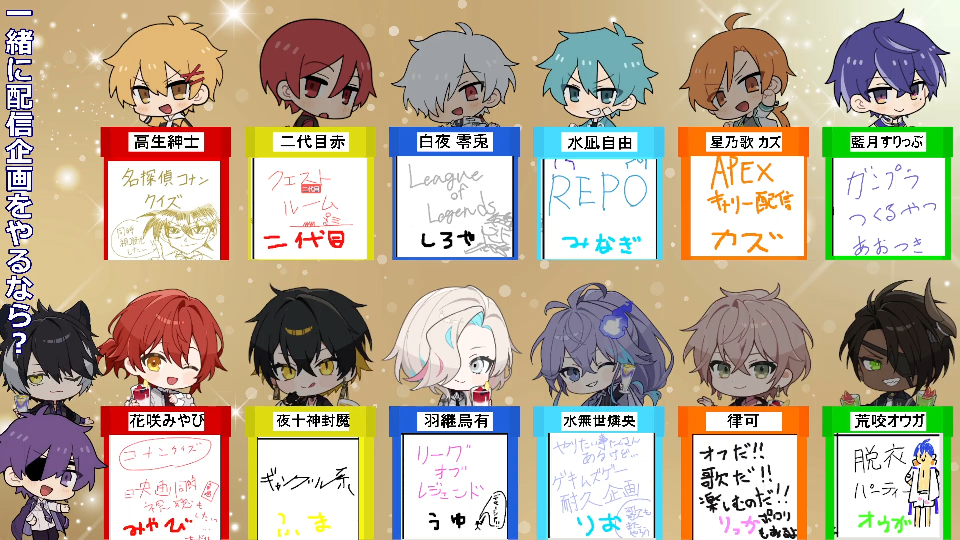 >>102837291They probably don't see the benefit because they all know eachother and only their fans would watch. Something like this at least gets new eyes on them. That said I think one of them should organize a collab like this with Niji too. Back when that HoloNiji baseball thing was happening with just the girls, I saw a lot of tweets of people wanting a StarsNiji men event.