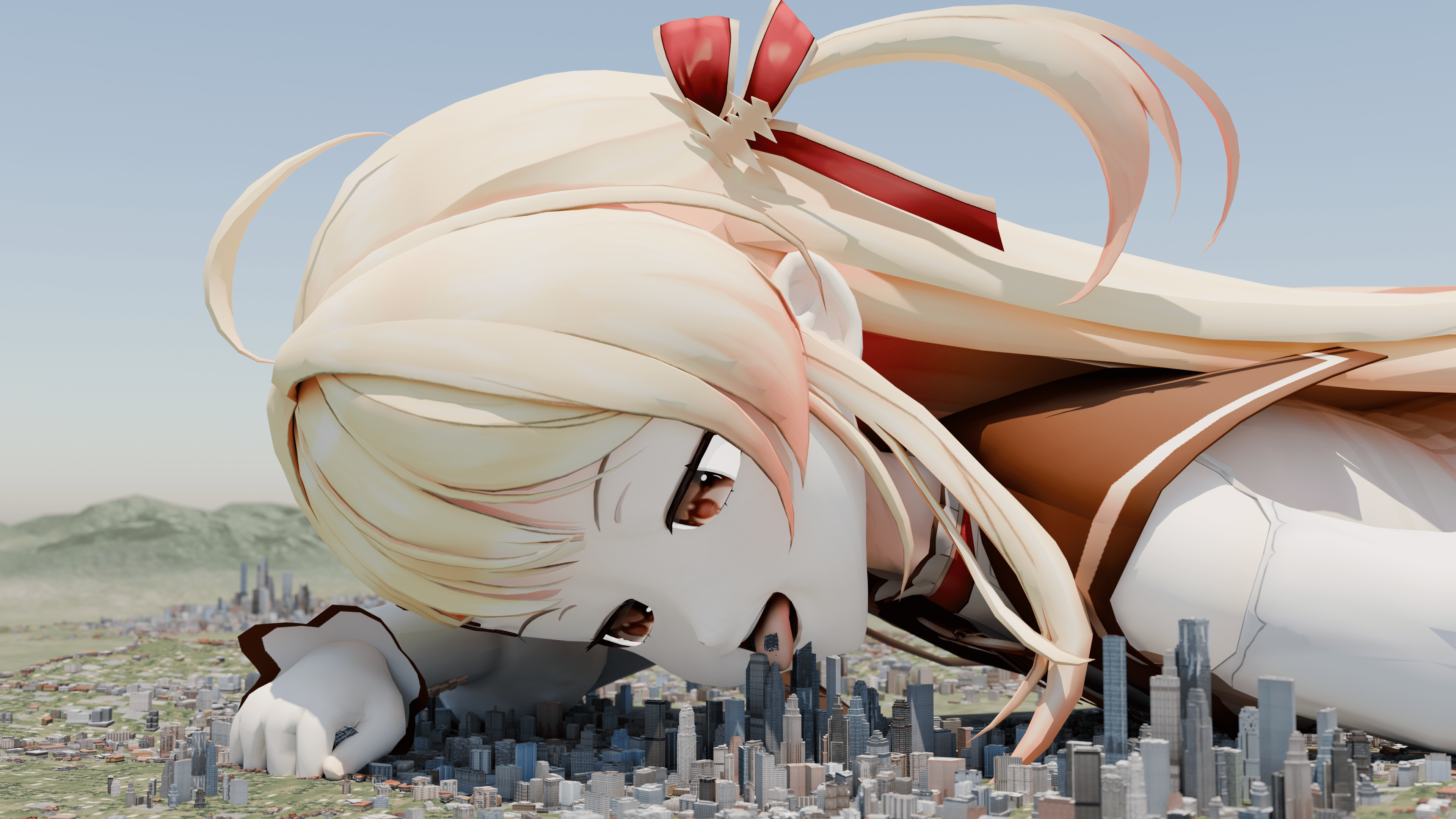 The pose itself is great since her body blocks parts of the background that would make things look less detailed, while still showing the city in the foreground. The shadow she's casting looks nice, but yeah a bit better lighting/coloring would help. But for a beginner render this is already looking really solid, good luck anon!