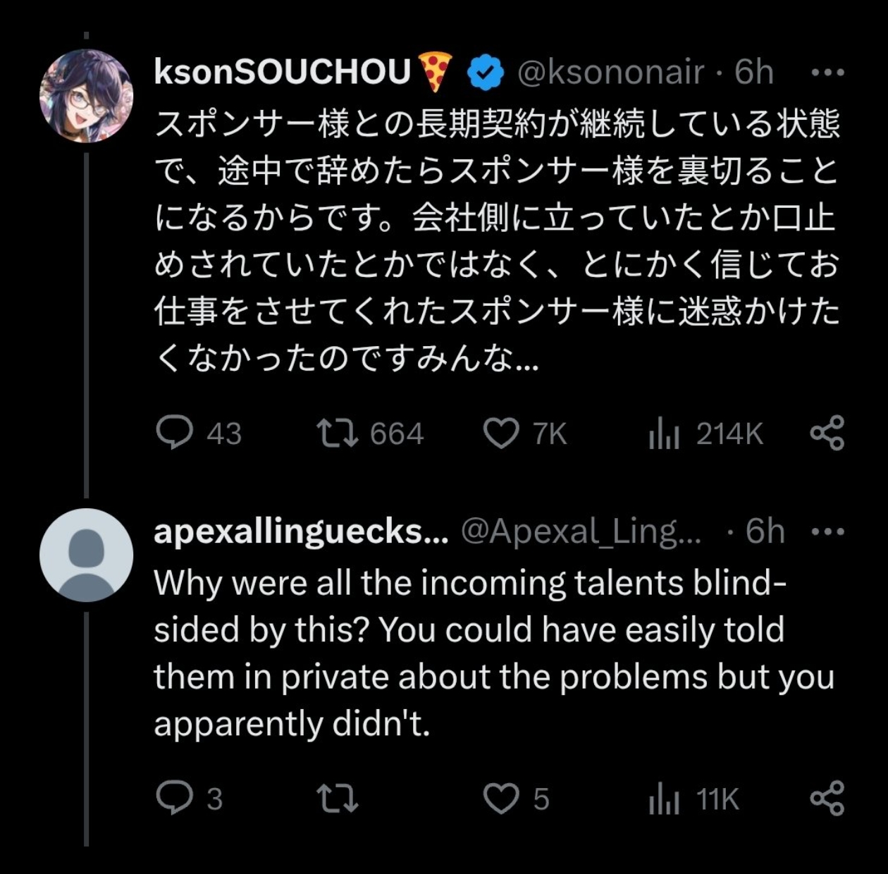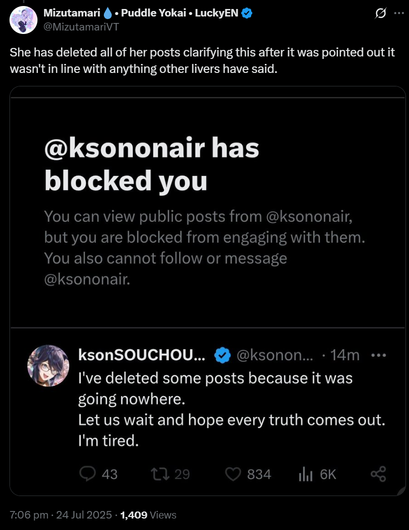 There's still people that I think are innocent. The people in ID, Michi and Kuro, I genuinely do not think they would be able to hide their involvement in anything shady, a bit of pressure and they'd just spill their hearts out. And the JPs seem completely unaware of all of the fuckery going on at the Californian HQ. But there's no way this is some binary "good talents vs evil executives" situation, it feels extremely sketchy.