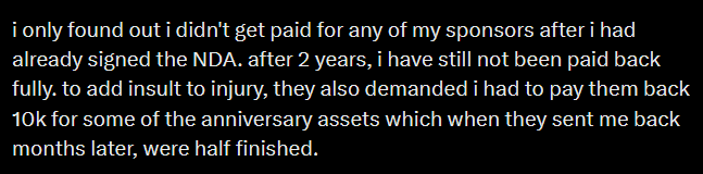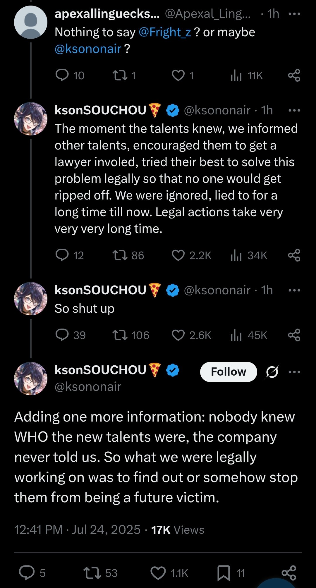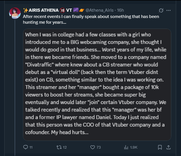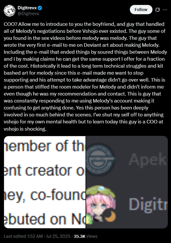 >>102729396The situation going on at Vshojo does not sound right at all if you really stop and think about it. Yes Gunrun, MTD, and many other execs or high ranking staff members are easily guilty as fuck, but most of the older talents don't exactly come off as innocent either. Nobody responds to Mel's post implosion tweets at all, there's rumors about how her BF was the COO, and now she's suddenly going on a break during all of this? Or even jump to the 6 minute mark of this recent Matara stream and pay attention to some of the shit she says: