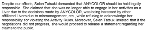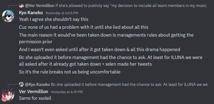 The "grassroots pushback" thing is really weird because it kinda sorta happened, just not in the way the leaker described, with the "we love our artists!" thing. So it's really fucking hard to tell if what the leaker was describing evolved into that, or if it was entirely coincidence. Also interesting is the talk of a "recently graduated liver" doing things... it was assumed to be Kyo at the time, but with hindsight we now knows that Vivi, who I believe was one of the first ones posting the artist stuff, likely turned in her graduation announcement around that time. And while she's never had anything good to say about Niji management... she has defended the other livers, and infamously one of her last streams was a colab with the clique trio themselves, Elira Enna and Millie. I wonder if the grassroots shit wasn't meant to take heat off Niji as a whole, but just the clique.