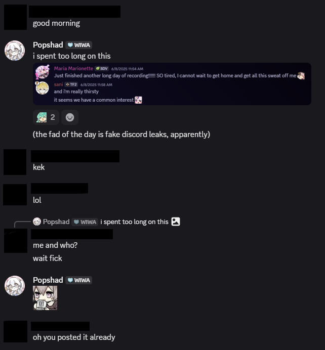 The leaker-san messages are old hat now but they still activate my almonds so very much... There's just enough wrong with them to be picked at, but at the same time just enough right to look plausible and like the wrong-seeming things are just an actual truth we don't have the full picture of.
