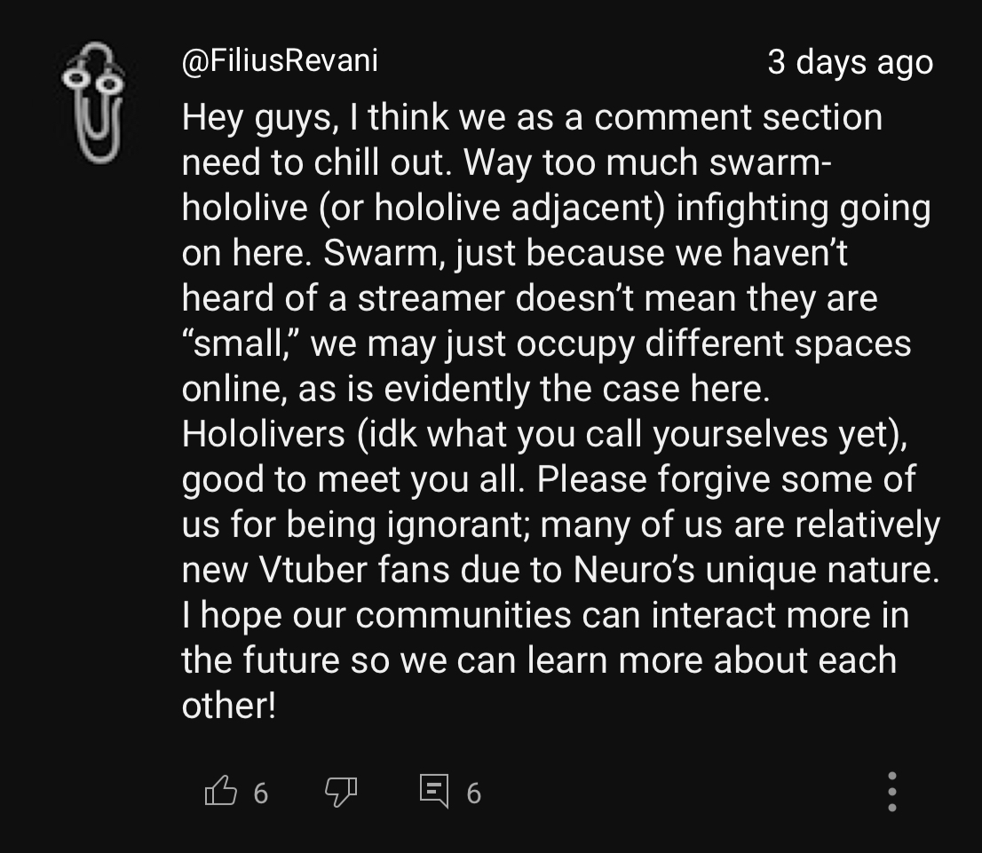 Neuro-sama is a neural network created by Vedal in 2018 for the purpose of learning to play osu! In December 2022 Vedal revived the project with the addition of a large language model, a TTS software and a Live2D model, which allow Neuro-sama to interact with her chat as a VTuber. Since then, she has been entertaining the chat with responses and unhinged rants nearly daily, as well as learning new skills such as singing, playing other games, and collaborating with other VTubers. Join /swarm/ today and welcome our new AI overlord!