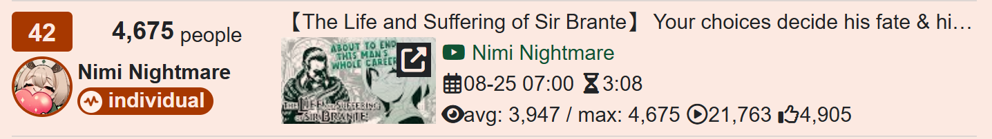 The only thing that saves her every time is no overlap. She had sub 2k while overlapping the concert. And 3k while overlapping Saba. She only regained viewers when both of of those ended. Else we would have seen her first sub 3k stream.