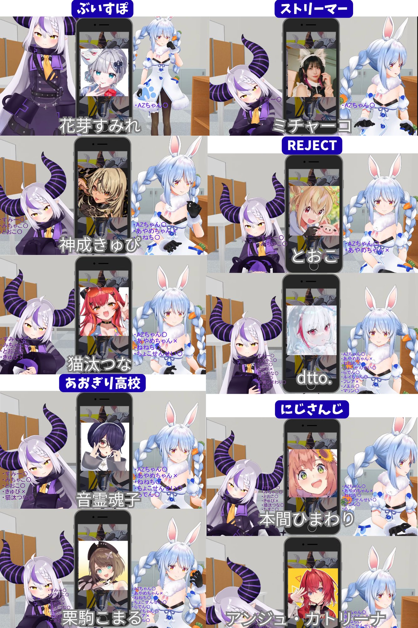 Includes but not limited to: Aogiri Highschool, Dot Live, Re:AcT, NoriPro, Neo-porte, VPI Cafe, Hololive, 2434, VSPO, Kizuna Ai Inc, 774 inc, VOMS, Strawberry Prince, VEE, Varium, Sinsogumi, Million Production, Aikatsu Academy, Hasunosora Highschool, Idolm@ster vα-liv, any other corpos, vsingers, ASMR and all JP indies regardless of scale