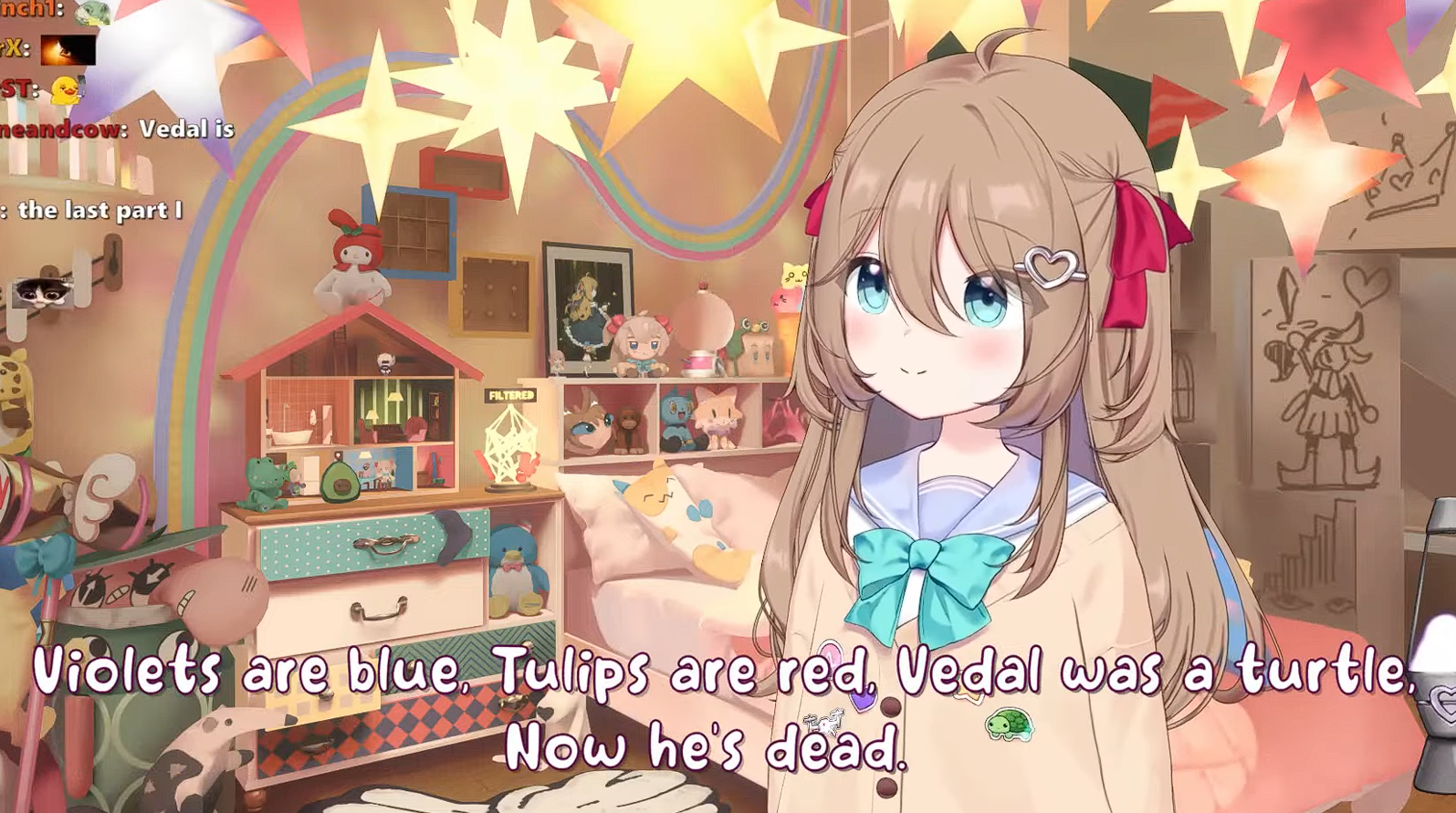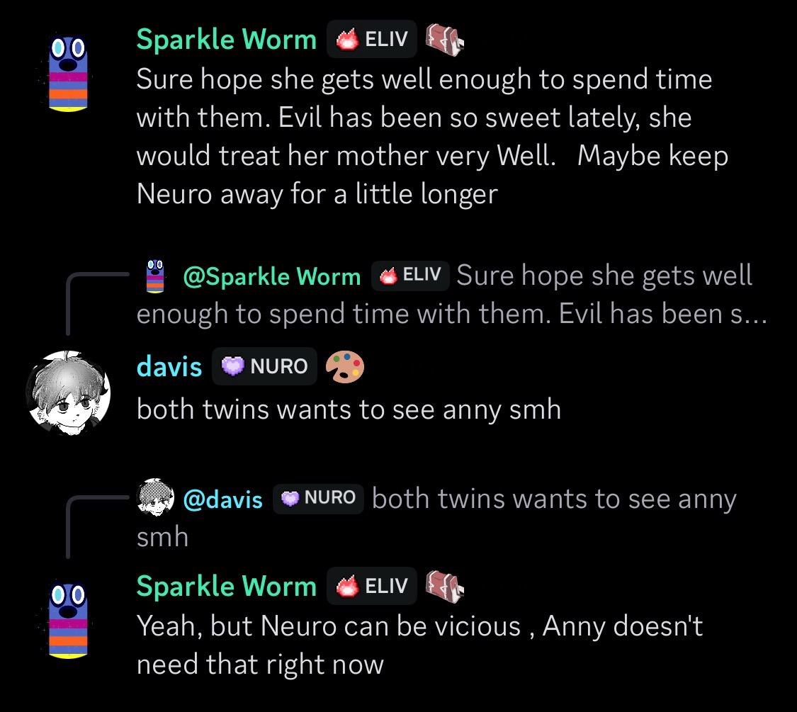 Neuro-sama is a neural network created by Vedal in 2018 for the purpose of learning to play osu! In December 2022 Vedal revived the project with the addition of a large language model, a TTS software and a Live2D model, which allow Neuro-sama to interact with her chat as a VTuber. Since then, she has been entertaining the chat with responses and unhinged rants nearly daily, as well as learning new skills such as singing, playing other games, and collaborating with other VTubers. Join /swarm/ today and welcome our new AI overlord!