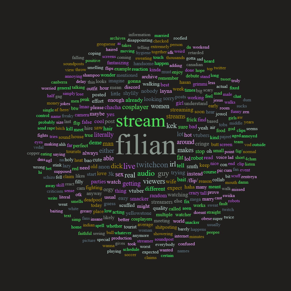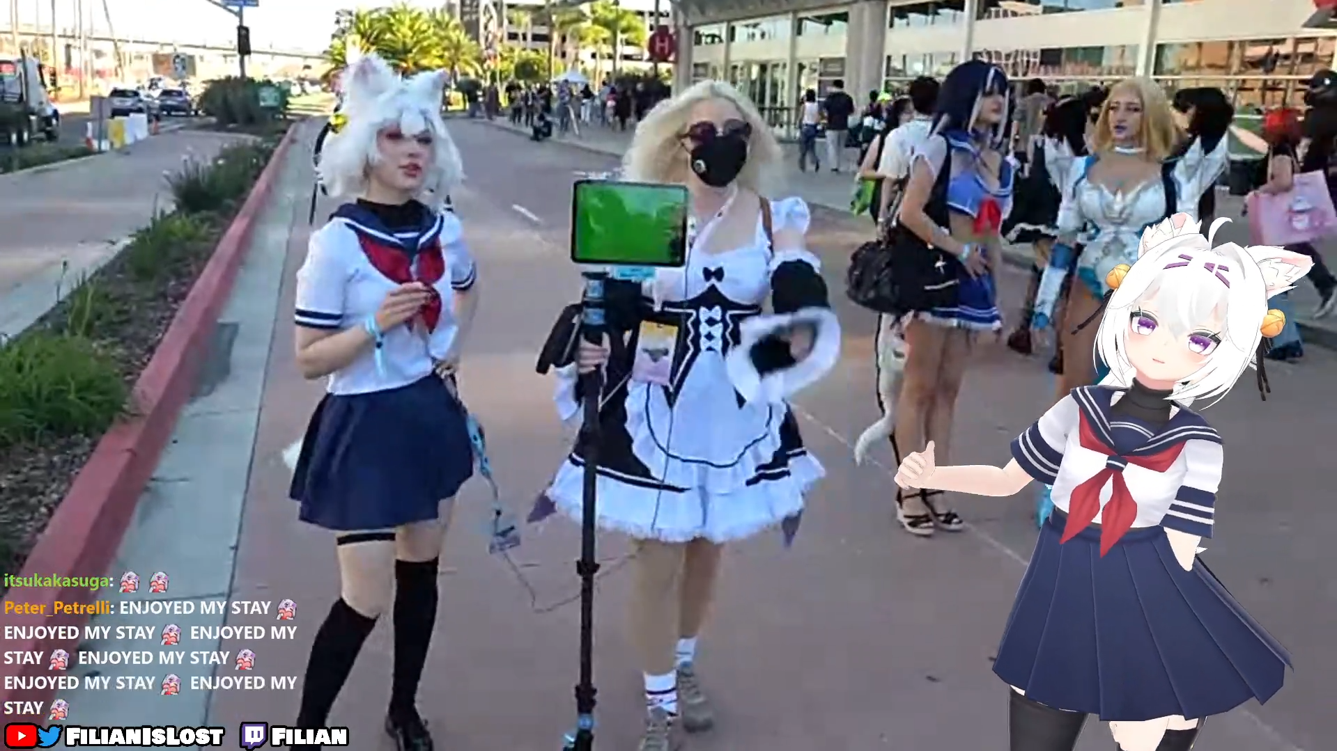 >She's there to spend time with her friends.She can just spend time with them at some other place in San Diego (which would be dangerous enough for her). I know she defiantelly wants to be able to walk around with her friends at Twitchcon, but she is savvy enough that she knows that people would clip her if she did. I mean, take that red haired girl that just randomly appeared in an OTK video for just a few seconds. Just because she had red hair and nobody knew who she was, there were enough people that immidiatelly suggested that it could be Filian. This was just some random girl in an OTK house...*