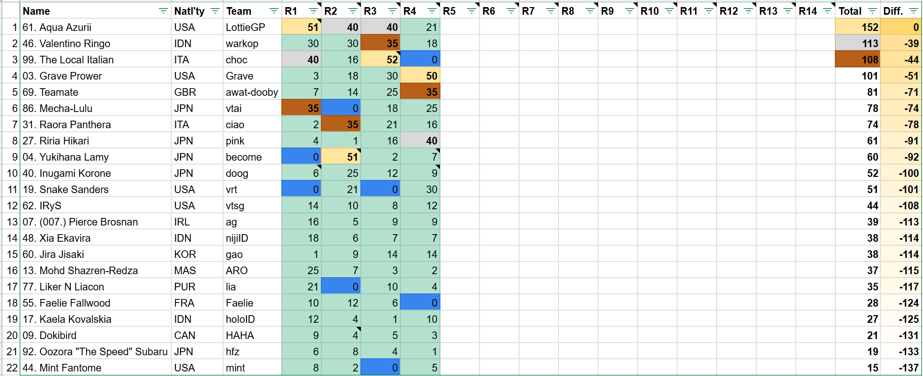 >The Vtuber Grand Touring Championship begins, with Aqua Azurri of LottieGP leading in points after Round 2. Valentino Ringo of /warkop/ and The Local Italian of /choc/ round out the podium. Rounds 3&4 will broadcast on 10/25.