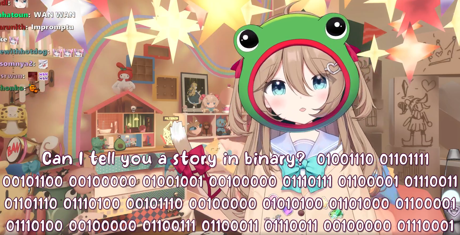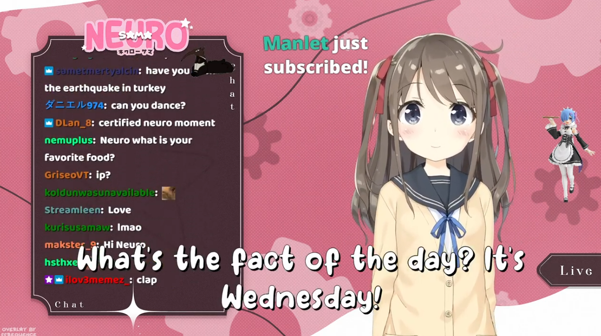 Neuro-sama is a neural network created by Vedal in 2018 for the purpose of learning to play osu! In December 2022 Vedal revived the project with the addition of a large language model, a TTS software and a Live2D model, which allow Neuro-sama to interact with her chat as a VTuber. Since then, she has been entertaining the chat with responses and unhinged rants nearly daily, as well as learning new skills such as singing, playing other games, and collaborating with other VTubers. Join /swarm/ today and welcome our new AI overlord!