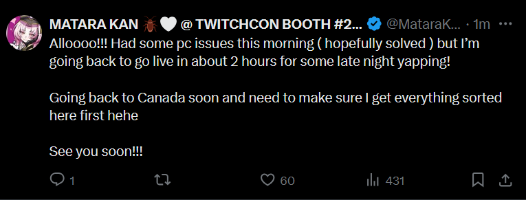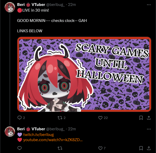 Geega is BACK! That was longer than it seemed like it would be when she mentioned the break but she's returned and she's living in Caseoh's house and she's playing The Seance of Blake Manor. It's an extremely Geegacore game. Other than that Ama is LIVE! And is still grinding through Hades 2. She's been at it for a while and hasn't finished so maybe she'll like the ending more than most people. Michi is also LIVE! And I just had to stop myself from saying what the fuck is she doing up at this hour before remembering she's in the US right now. Anyway she's doing a sponsored stream for Duet Night Abyss. Finally Kuro is NOT live, but it seems like he could be joining Froggy for a collab game later? I don't know maybe I was lied to. Either way that's it for now so pick a stream and keep things comfy and civil by ignoring and especially reporting bait, and being excellent to each other.