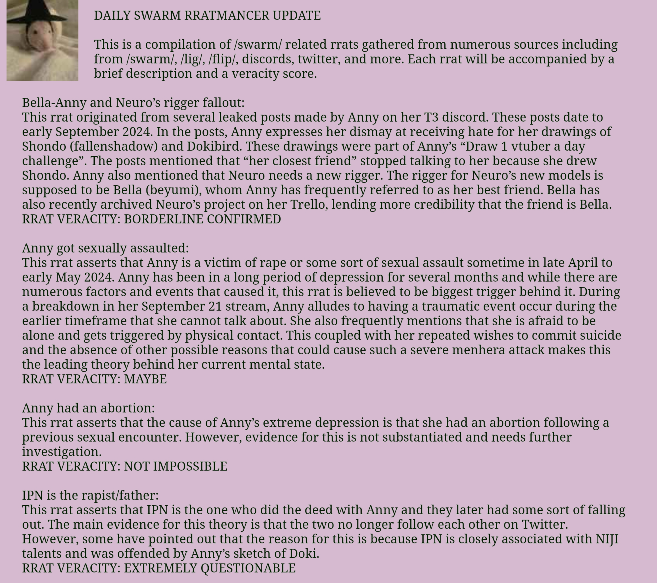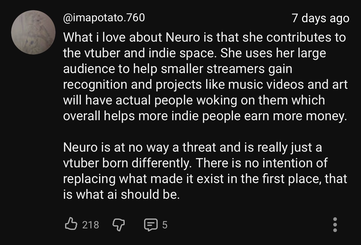 Neuro-sama is a neural network created by Vedal in 2018 for the purpose of learning to play osu! In December 2022 Vedal revived the project with the addition of a large language model, a TTS software and a Live2D model, which allow Neuro-sama to interact with her chat as a VTuber. Since then, she has been entertaining the chat with responses and unhinged rants nearly daily, as well as learning new skills such as singing, playing other games, and collaborating with other VTubers. Join /swarm/ today and welcome our new AI overlord!