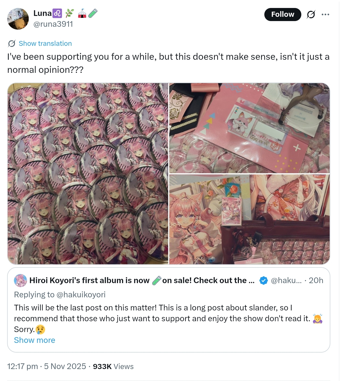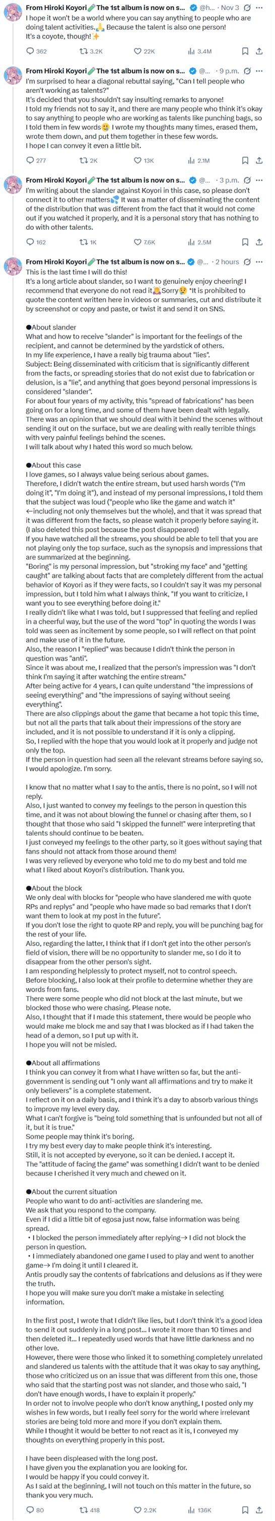 My initial post included my dislike of lies, but thinking it wouldn't be good to suddenly post something long, I wrote and deleted over 10 times, using harmless words with less darkness. However, there were people connecting it to completely unrelated things and defaming us talents with the attitude that they can say anything, people criticizing from different angles than this issue, people saying the original post wasn't defamatory, and people saying "You didn't explain enough. You need to explain properly."