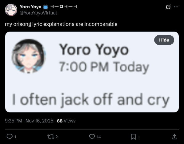 Large indie vtubers have more net fans, but they are outnumbered by 2views by the thousands. This is a thread for the VIP, regardless of what language they stream on.