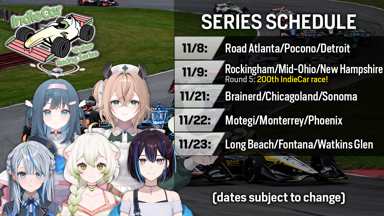 >SquChan currently leads IndieCar's standings as of Round 6. Rounds 7-9 will be streamed on 11/21.