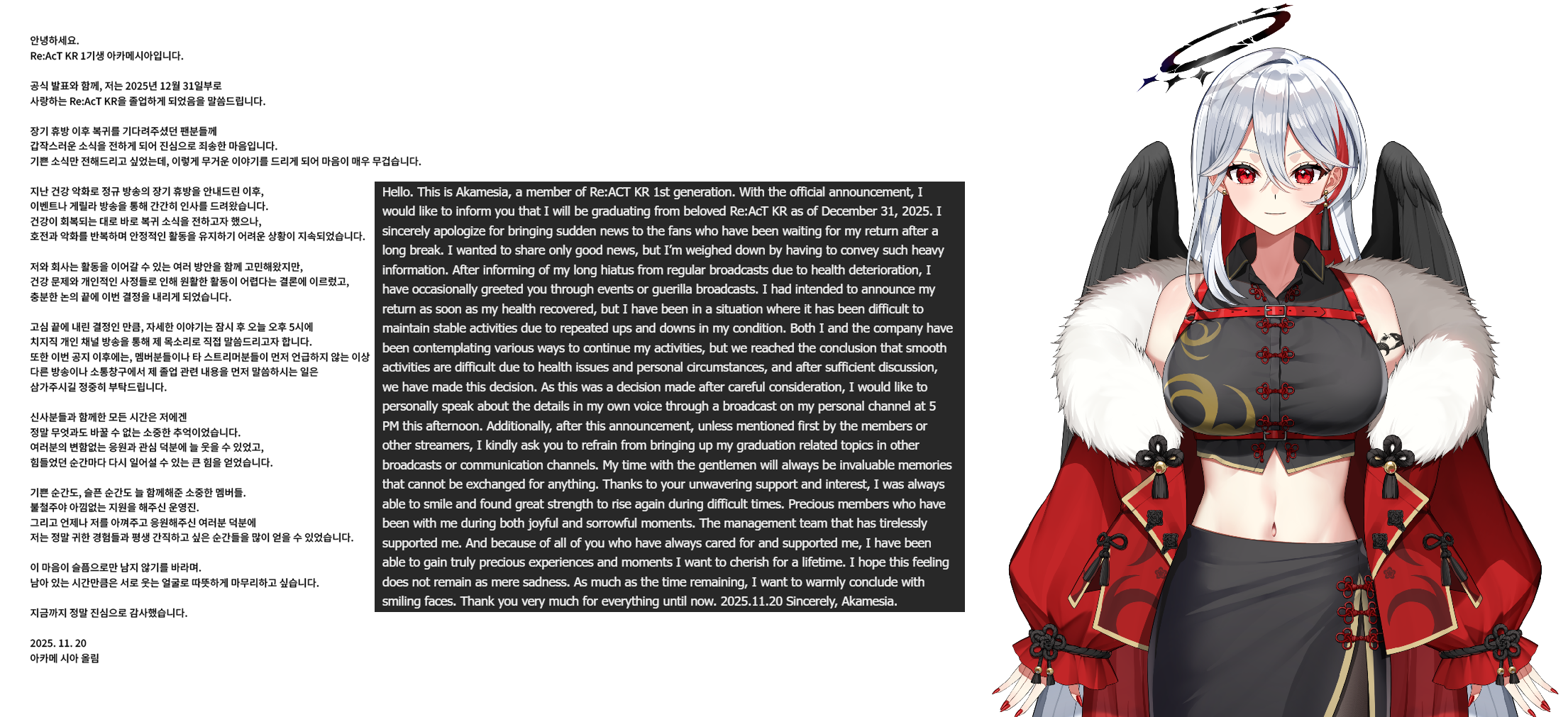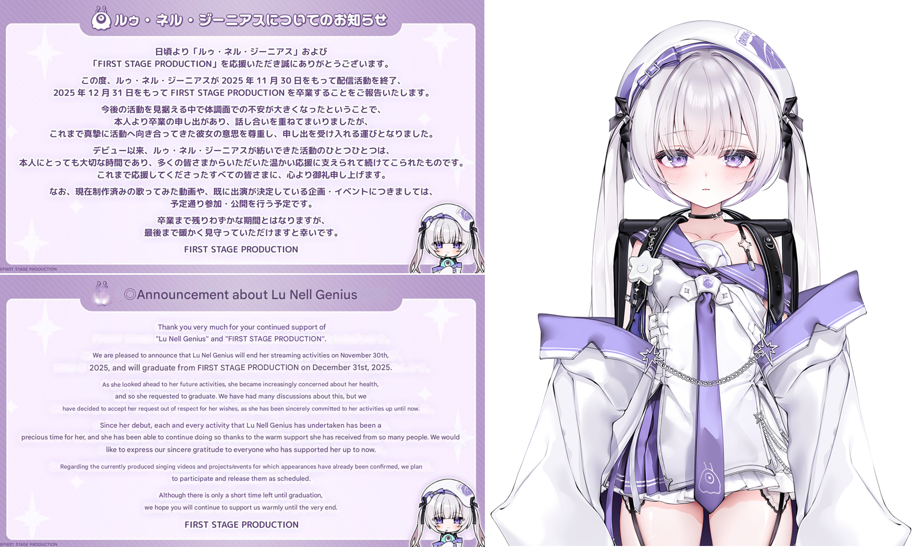 >Amane Kanata announces that she is likely to have an intermittent appearance schedule, as her Meniere's Disease has been worsening.
