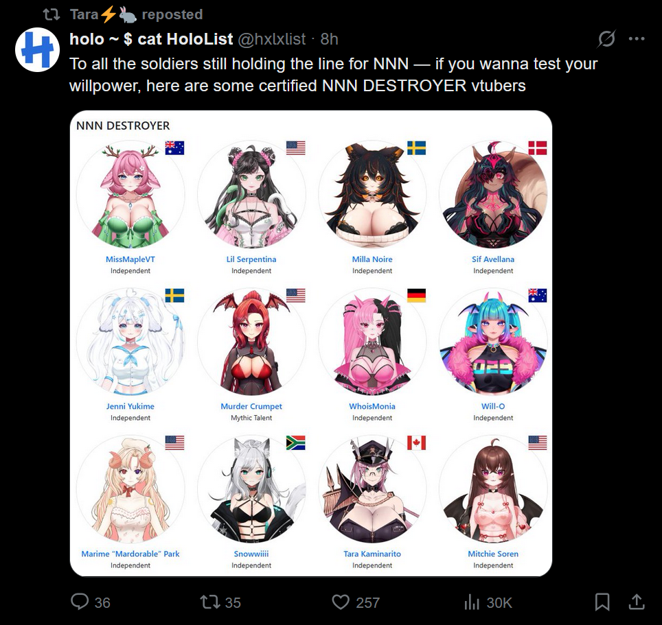 Large indie vtubers have more net fans, but they are outnumbered by 2views by the thousands. This is a thread for the VIP, regardless of what language they stream on.