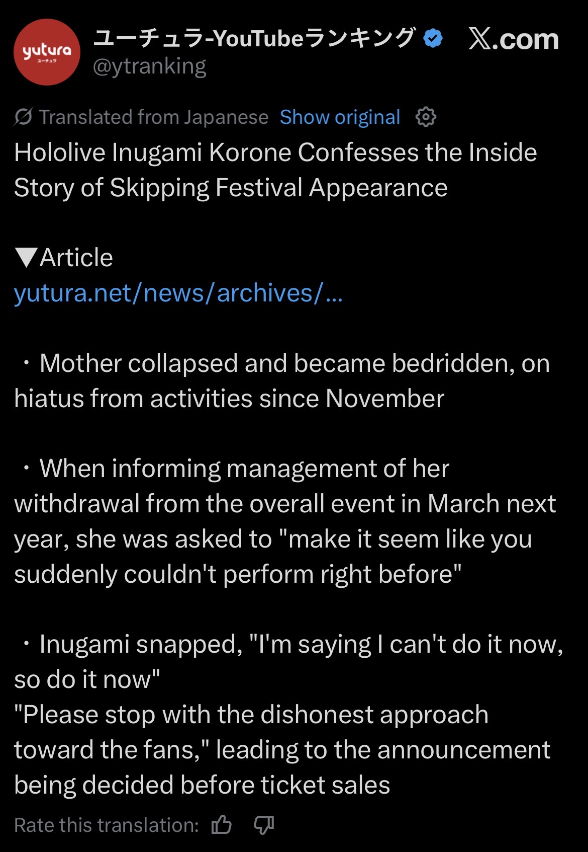 >>107733386At this point, what she really trusts is not Cover, but just Yagoo specifically. A-chan represented the talents to management well, but she’s gone now and management has now been compromised by the shareholders' infinite greed. The only line of defense left for the talents is Yagoo. If he ever stops being the majority shareholder, that's when it’s truly over for Hololive. That's when the mass exodus will begin because if Yagoo leaves, it will mostly definitely be through a hostile takeover, and that new Wall Street puppet will take all the money away from the talents, give all of it to the shareholders, and hold the talents hostage so that they can never graduate.