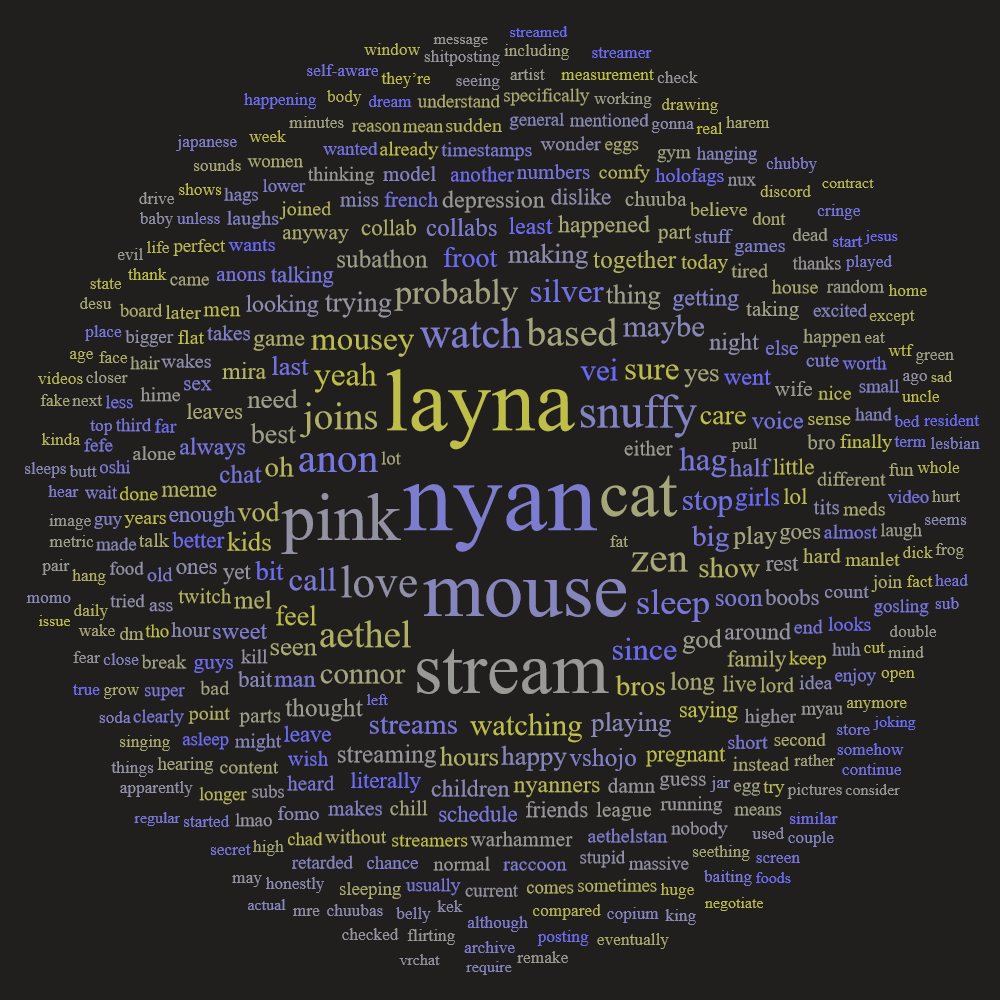 The big ongoing thing is still big and ongoing. As of this moment Mouse is down to just under 8 hours left on the clock but there could be plenty more to come. She's sleeping once again and after a bit of fun conversation from Nyan, Snuffy, Zen, Layna, and Silver they've all left so it's just Layna and Nyan hanging out while Mouse dreams away. But aside from that today is also Mel's second anniversary! Which would get a lot more attention, but it's her anniversary at a site that's not blue board friendly so the 2 year Twitch anniversary will be coming soon. That's all for now though so keep things comfy in the meantime by ignoring bait, reporting it if you see it, and being excellent to each other.