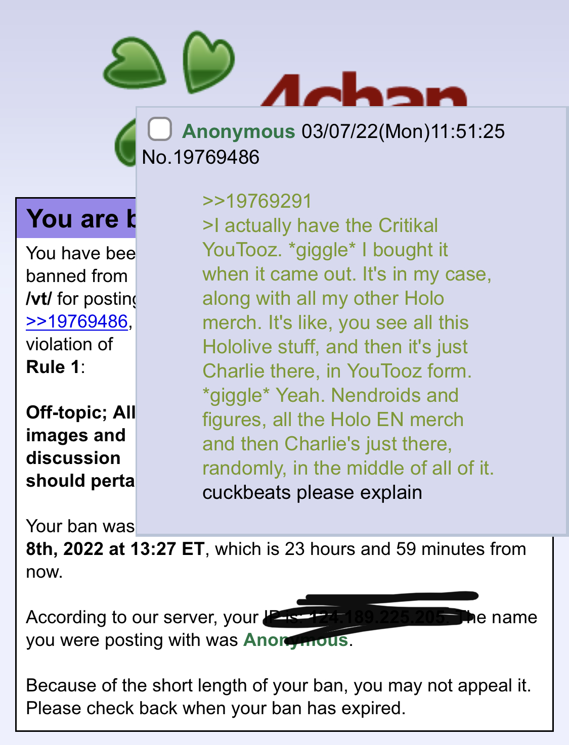 Note.com, her static IP was revealed. And it turned out, there was a shitposter on 5channel with the same IP address. The said shitposter is known as "ec" because of their id. This shitposter posted on vtuber board and there were thousands of pretty juicy posts that shittalked other vtubers (including your favourite holos), and even doxxed some of them, revealing sensitive information that could only be known by someone who met them personally. The discussion of those posts was a hot topic for almost half a year.